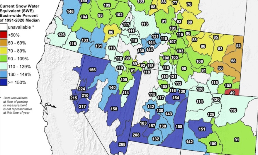 Colorado Snowpack Map 2024 Current – Snowpack that will feed the Colorado River this summer has reached 100% of normal levels for the first time in 2024, according to tracking by the U.S. Bureau of Reclamation. . The attention is on Southern California right now, but an atmospheric river’s path will extend inland with potential flooding — and possible drought relief. .