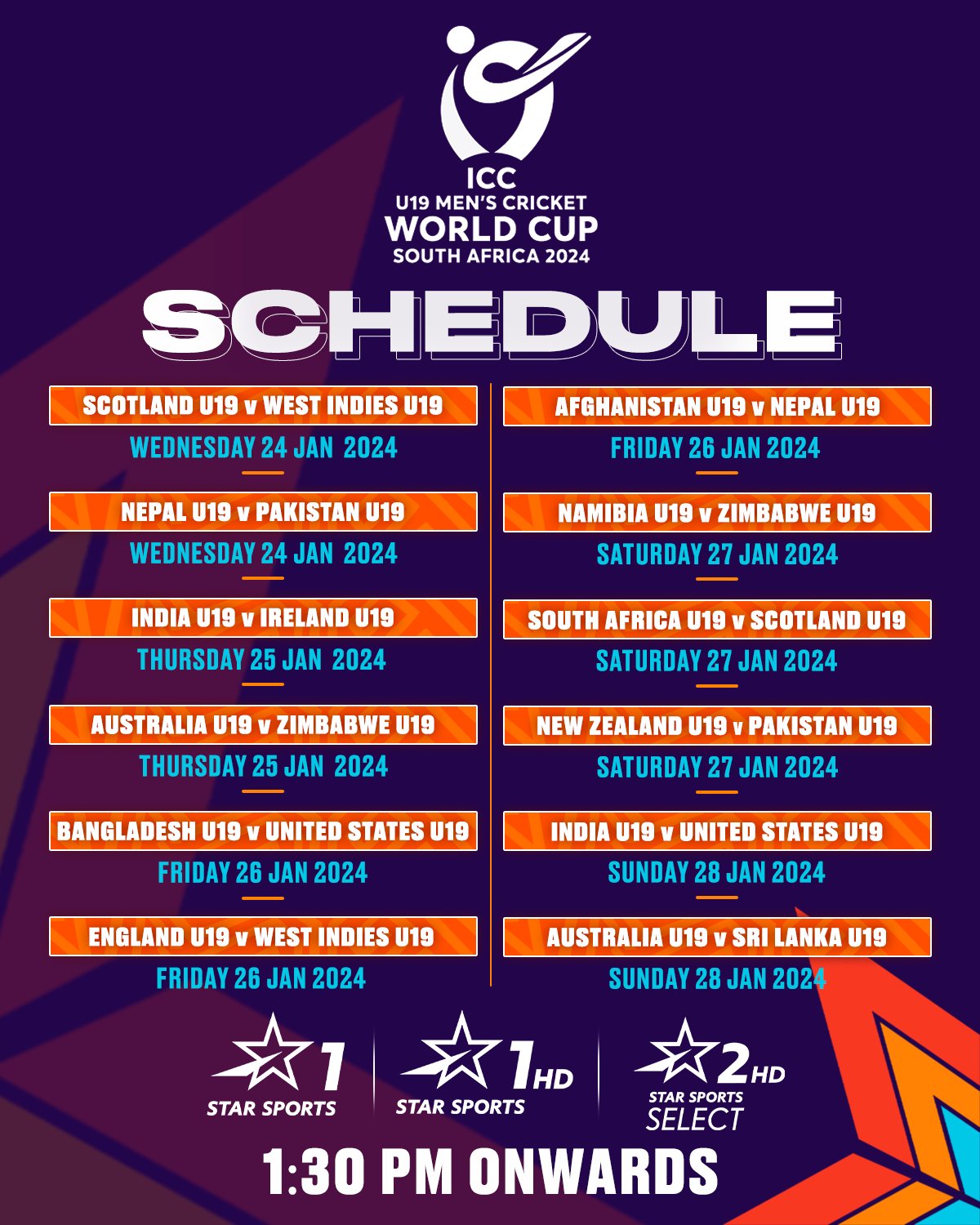 Icc U19 World Cup 2024 Schedule Pdf – Twelve of the 16 participating nations have moved onward in the ICC Under-19 Men’s Cricket World Cup 2024, where they will now partake in a brief ‘Super Six’ round en route to the semi-finals. . The ICC Under 19 Men’s Cricket World Cup is all set to kick off on 19 January 2024, with a double header pitting hosts South Africa against the West Indies and Ireland taking on the USA. The 15th .